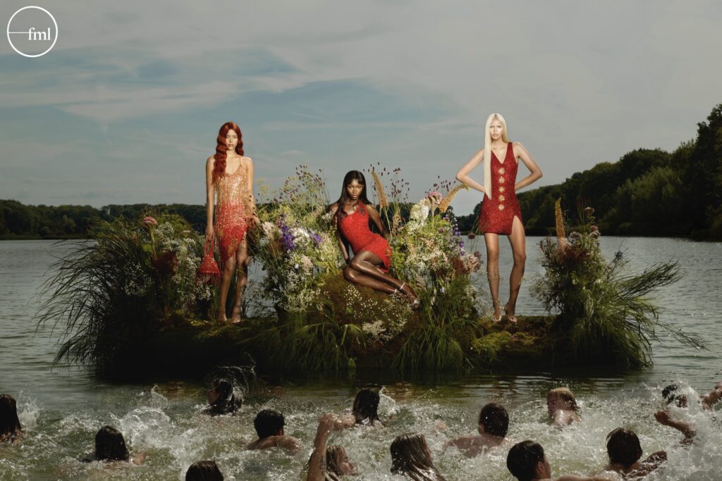 TW: The setting in Amsterdam I belief created a sense of suspension and contrast. On the main campaign image the sirens are elevated on their beautiful flower adorned island and stand still in powerful poses, while the world around them is in motion. That tension reinforces their sovereignty – they are grounded, self-possessed, and untouched by the chaos.