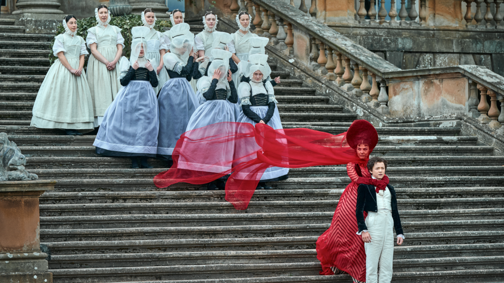 The fashion and set design do more than beautify, they enact the film’s interrogation of hubris. Every lavish garment has a tear, every polished corridor hides rot, every refined tool echoes executioner’s blade. The creature’s movement, graceful yet contorted, reveals his dual nature: part angel, part executioner. His costume design, while fittingly monstrous, preserves something of the human beneath, stitch lines, prim tailoring beneath the gore. Photographed in silhouette against a steel-blue dawn, the creature looks less like a horror archetype and more like a tragic monument.